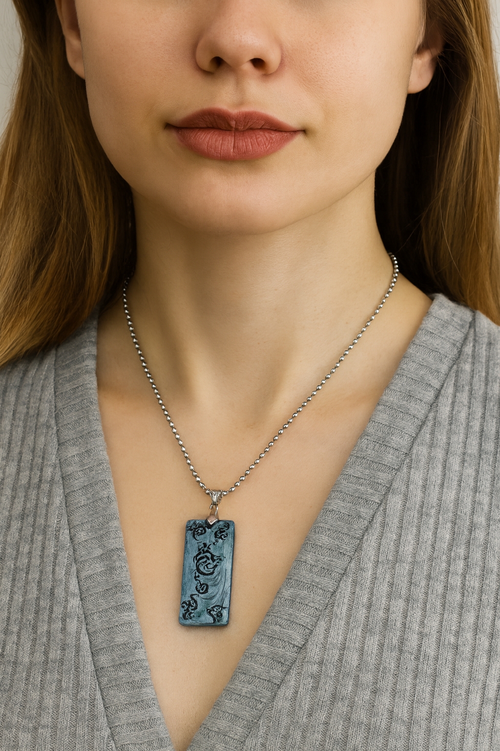 Pendant is hanging on an 18 inch silver ball chain. Pendant size 1 3/4 long , 3/4 wide