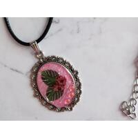 This violet pendant embodies a harmonious blend of delicate beauty of luxurious sophistication. Crafted with intricate detail, the pendant features an enchanted white blossom delicately printed against a backdrop of shimmering purple glitter, evoking a sense of ethereal charm and grace. Suspended from a 16 inch black cord, this exquisite piece adds a touch of elegance and whimsy to any ensemble, making it the perfect accessory for those who appreciate both the enchantment of nature and the allure of glamour. Wear it to adorn our neckline with a captivating symbol of beauty and refinement.