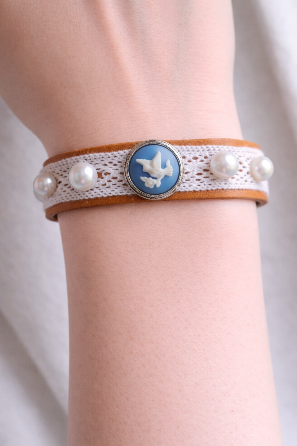 A stunning blend of elegance and compassion Crafted with ethically sourced materials, this bracelet features intricate lace intertwined with lustrous faux flat pearls, creating a timeless piece that exudes grace and sophistication. Perfect for those who value style and sustainability, this bracelet is a beautiful addition to any outfit, offering a cruelty-free alternative without compromising on beauty or quality. Elevate your look with this chic accessory while making a statement for ethical fashion.