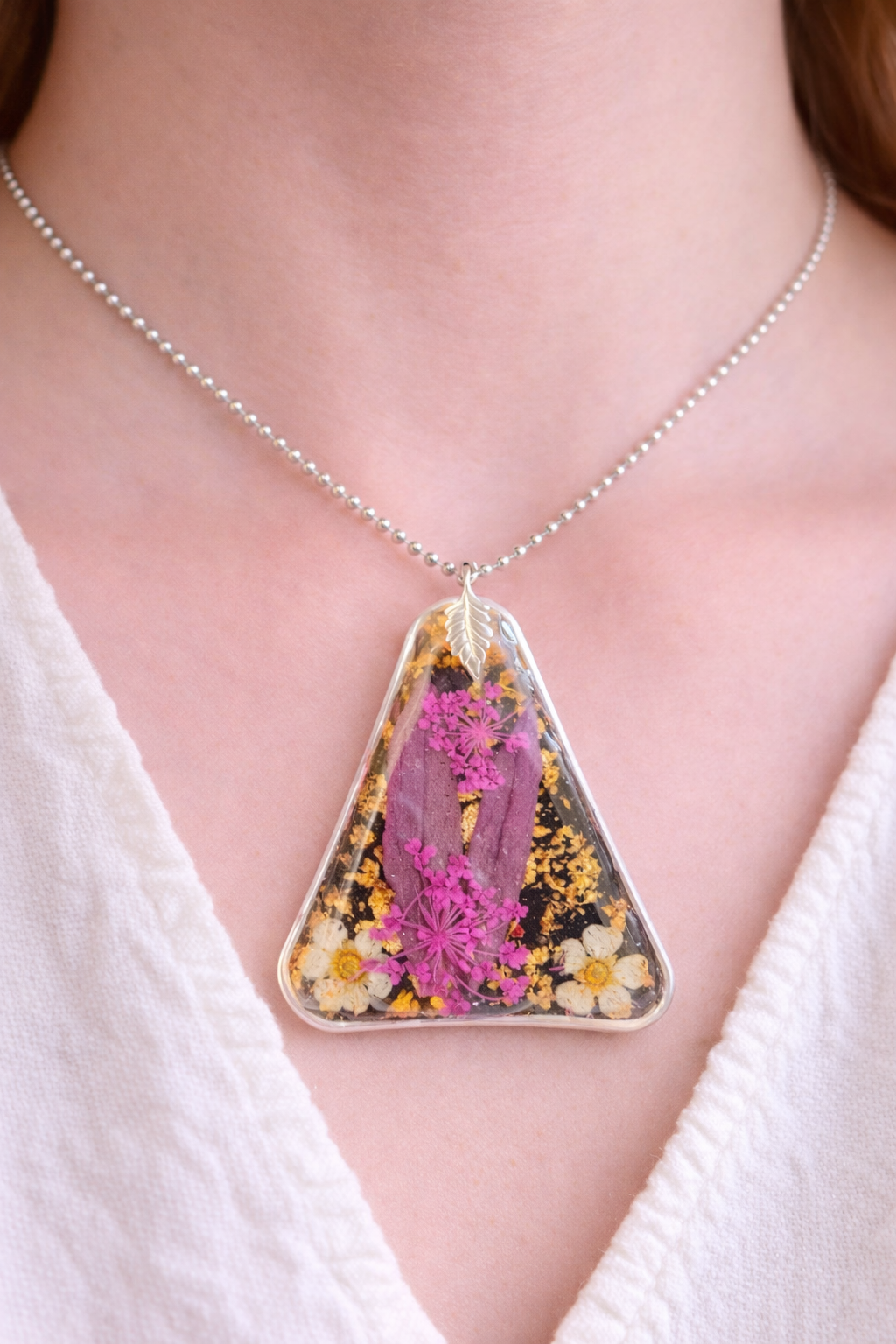 Capture the beauty of nature with this delicate handmade pendant. Real flowers are carefully preserved in crystal-clear resin, encased in hand-shaped wire bezel that highlights their natural charm. The bezel elegantly frames the flowers, creating a one-of-a kind piece. This unique pendant hands gracefully on a silver ball chain, offering a blend of nature and craftsmanship. This necklace is a timeless reminder of nature's fleeting beauty,