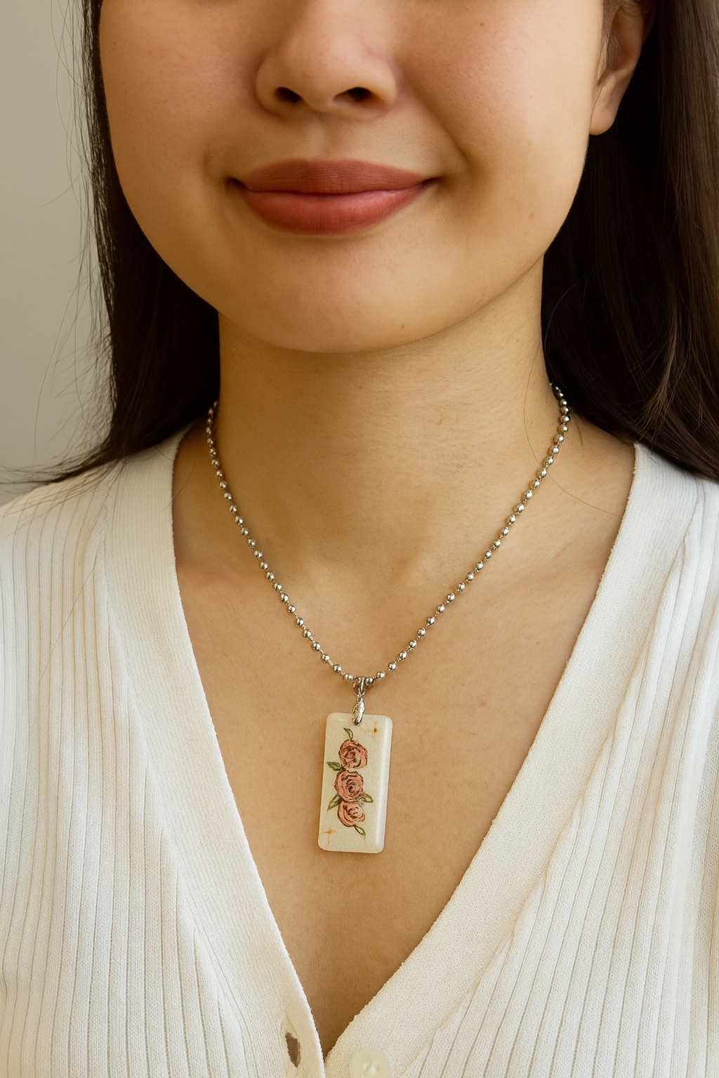 This elegant white blossom resin pendant showcases a delicate rose center. The smooth, glossy finish highlights the floral design. making it a graceful accessory perfect for adding a touch of sophistication to any outfit.